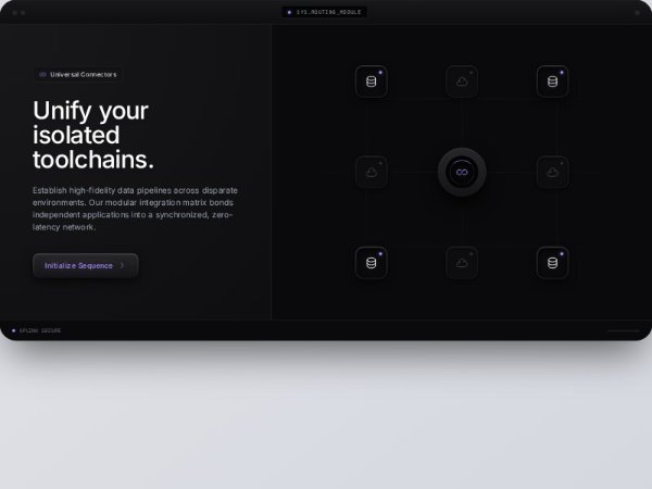 A dark, futuristic Tailwind CSS hero section promoting platform integrations. Features split-layout marketing copy, a CTA button, and an animated system-style network visualization for SaaS, API, or infrastructure landing pages.