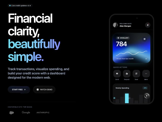 Two-column hero section for a finance app, featuring animated headline copy, gradient CTA buttons, bank logos, and a detailed mobile dashboard mockup with credit score, quick actions, charts, and recent activity. Built with Tailwind-style utility classes and scroll animations.