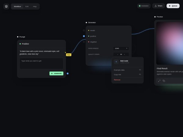 Fullscreen hero-style workflow canvas showcasing an AI image generator UI with prompt, generator, and preview panels, glowing connection wires, contextual node menu, and a collaborative cursor effect. Built with Tailwind CSS and custom CSS for an interactive app demo layout.