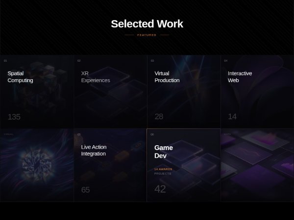 A dark-themed portfolio grid section featuring square cards with glassmorphism effects, image hover transitions, reveal-up animations, and data metrics. Perfect for showcasing digital agency work, tech projects, or creative services in a high-end visual layout.