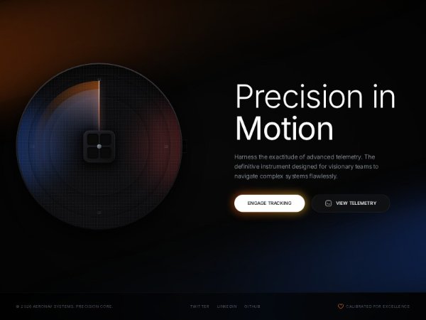 A full-screen dark hero section featuring an animated telemetry-inspired circular device, bold headline, CTA buttons, atmospheric gradients, and a compact footer. Built with Tailwind CSS for futuristic landing pages, product showcases, or tech brand websites.