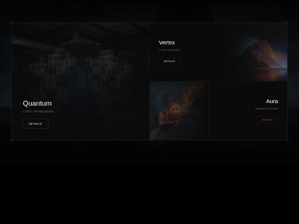 A dark, futuristic product grid section with layered imagery, hover animations, gradient overlays, and detail buttons. Built with Tailwind CSS, it showcases multiple products or features in a responsive split-layout for landing pages or portfolio sites.