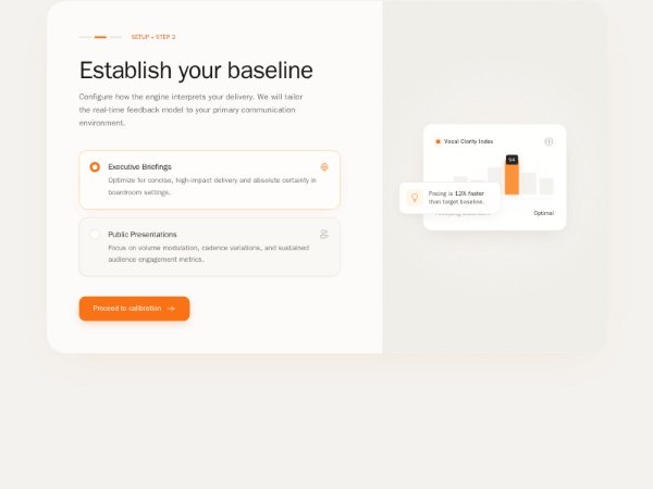 A polished onboarding interface with a step indicator, selectable setup options, CTA button, and animated product analytics preview. Built with Tailwind CSS and custom float animations for SaaS onboarding, setup, or calibration flows.
