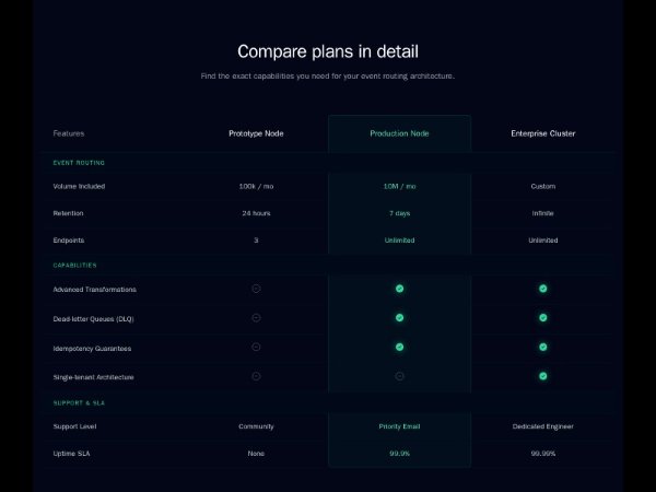 A dark-themed responsive pricing section with a feature comparison table for multiple plans. Built with Tailwind CSS and Iconify icons, it highlights a recommended tier and supports horizontal scrolling for smaller screens.