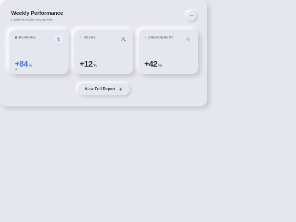 Neumorphic dashboard widget showing weekly performance metrics with three animated metric cards and SVG line charts, a header with options button, and a CTA button. Built with Tailwind utilities and custom CSS for neuomorphic shadows and subtle animations.