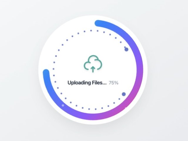 A circular upload progress UI with animated SVG rings, gradient stroke progress, rotating dashed inner ring, and cloud upload icon. Built with Tailwind CSS and Iconify, ideal for file upload states, dashboards, and loading feedback.