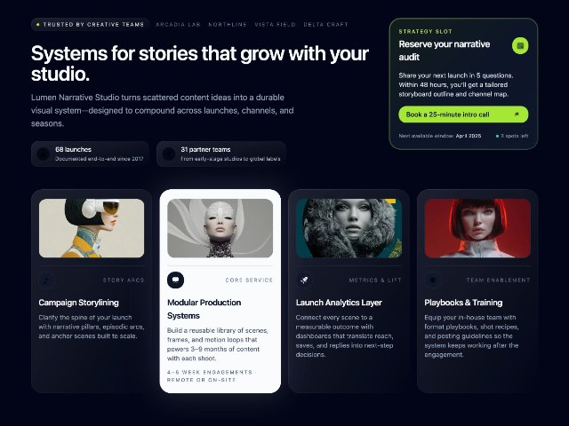Full-width hero section highlighting a narrative studio’s services with trusted-by brands, headline, stats, a prominent booking CTA card, and a responsive 4-card services grid. Styled with Tailwind-like utility classes for modern, marketing-focused layouts.