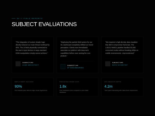 A full-width testimonial section with three evaluation cards and supporting performance stats. Styled with Tailwind CSS, it uses a dark futuristic aesthetic, responsive grid layout, and scroll-reveal interactions for product, tech, or case study pages.