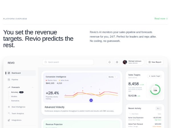 Full-width Tailwind-styled platform overview section showcasing an AI sales dashboard with sidebar navigation, charts, KPI cards, activity feed, and revenue forecasting visuals. Ideal for SaaS, analytics, and product feature landing pages.
