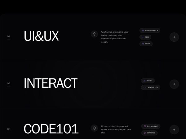 Dark glassmorphism feature section showcasing three course or service offerings with numbered rows, badge chips, CTA buttons, word-reveal text animation, and a Three.js WebGL visual. Built with Tailwind CSS for modern landing pages.