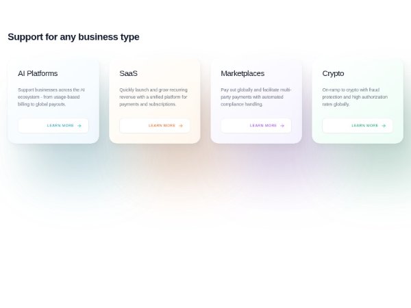 A responsive Tailwind CSS feature section showcasing four business categories with gradient cards, hover lift effects, icons, and CTA links. Ideal for fintech, SaaS, or platform landing pages highlighting industry-specific solutions.