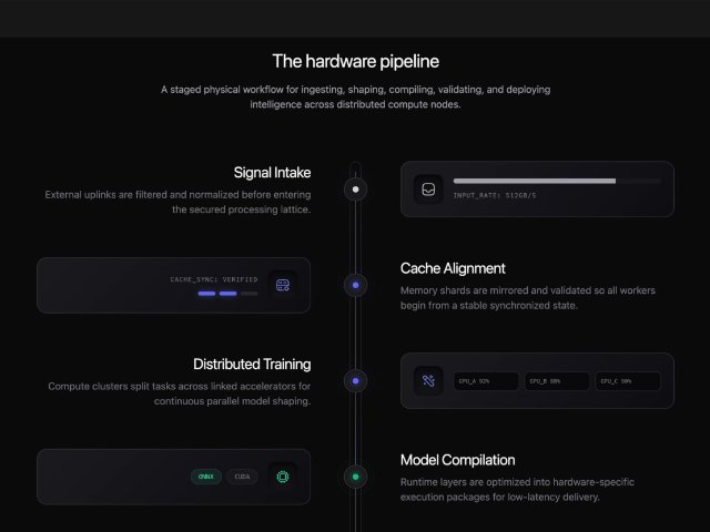 A dark-themed Tailwind section visualizing a multi-step hardware or AI deployment pipeline with alternating timeline cards, progress indicators, icons, and scroll-triggered animations. Ideal for tech product, infrastructure, or platform landing pages.