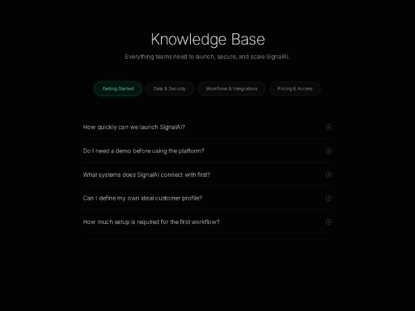 Dark-themed Tailwind FAQ/knowledge base section with category tabs, animated accordion items, and color-coded states. Ideal for product docs, help centers, onboarding, and support pages.