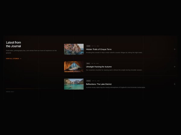 A two-column blog journal section featuring a heading, description, and call-to-action on the left with a responsive list of linked article cards with images, categories, dates, and hover interactions on the right. Styled with Tailwind utility classes for modern layouts.