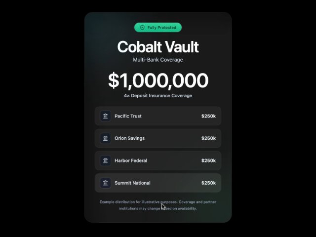 Responsive Tailwind CSS card showcasing deposit insurance coverage with badge, headline amount, bank distribution list and note. Includes blurred glow accents, hover effects and layered shadows—ideal for fintech dashboards or coverage/pricing summaries.