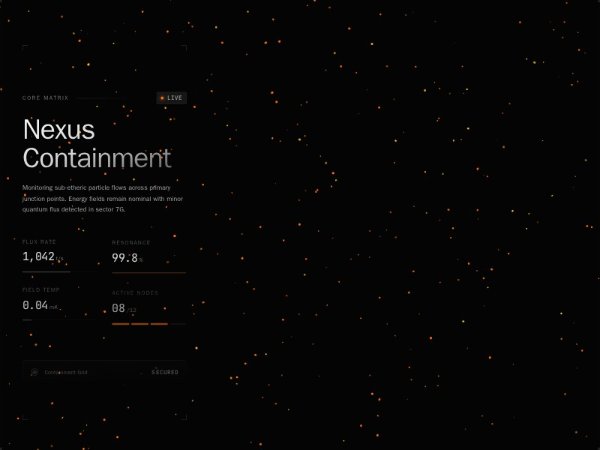 A full-screen futuristic hero section built with Tailwind CSS, featuring telemetry panels, concentric UI graphics, GSAP reveal animations, and an interactive canvas particle system centered around a glowing call-to-action button.