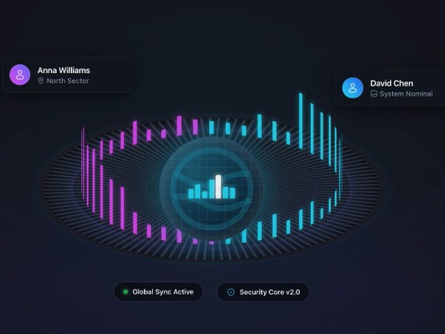 An animated full-screen sci-fi UI scene featuring a 3D radial data floor, holographic center sphere, floating glassmorphic status cards, and dynamic chart bars. Built with Tailwind CSS and JavaScript for dashboard, hero UI, or tech showcase layouts.