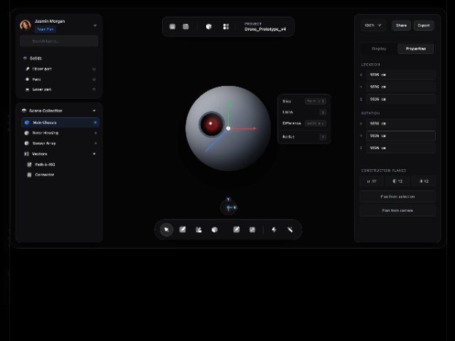 Full-width animated mock UI of a 3D modeling editor, featuring sidebars, toolbars, layer list, properties panel, and a central 3D object viewport with HUD controls. Built with Tailwind-style utility classes for use as a hero-style app UI preview.