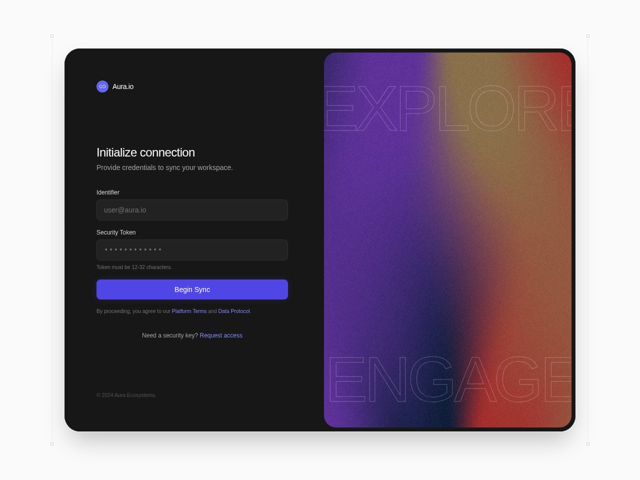 Aura.io Initialize connection Provide credentials to sync your workspace. Identifier Security Token Token must be 12-32 characters. Begin Sync By proceeding, you agree to our Platform Terms and Data Protocol . Need a se…
