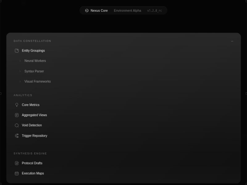 Nexus Core Environment Alpha v1.2.0_rc Data Constellation Entity Groupings Neural Workers Syntax Parser Visual Frameworks Analytics Core Metrics Aggregated Views Void Detection Trigger Repository Synthesis Engine Protoc…