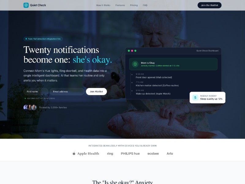 Quiet Check Elder Monitoring Landing Page Template | Aura