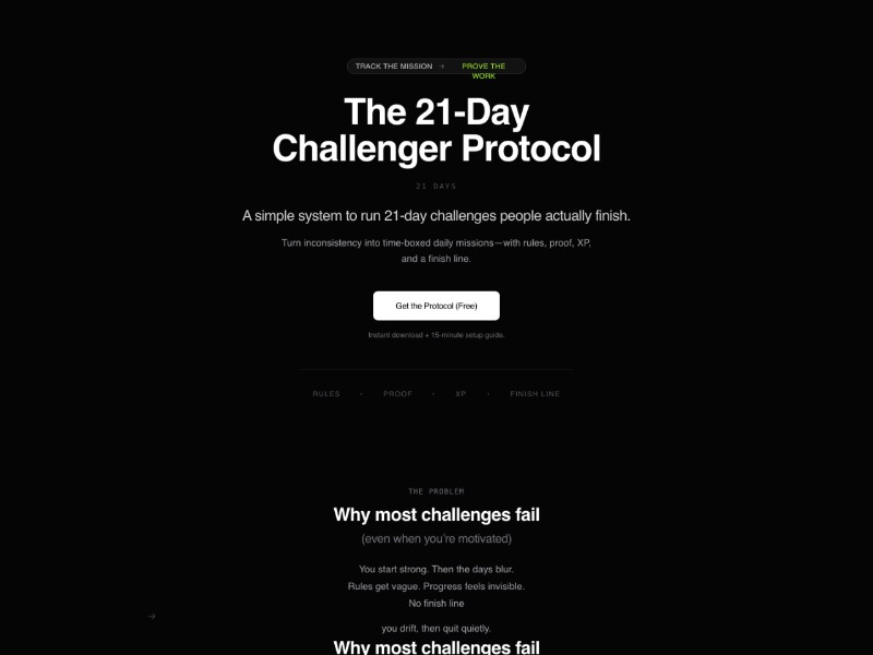 A high-converting template for promoting a 21-day challenge protocol, helping you present rules, missions, and proof systems with a gamified, dark UI layout.