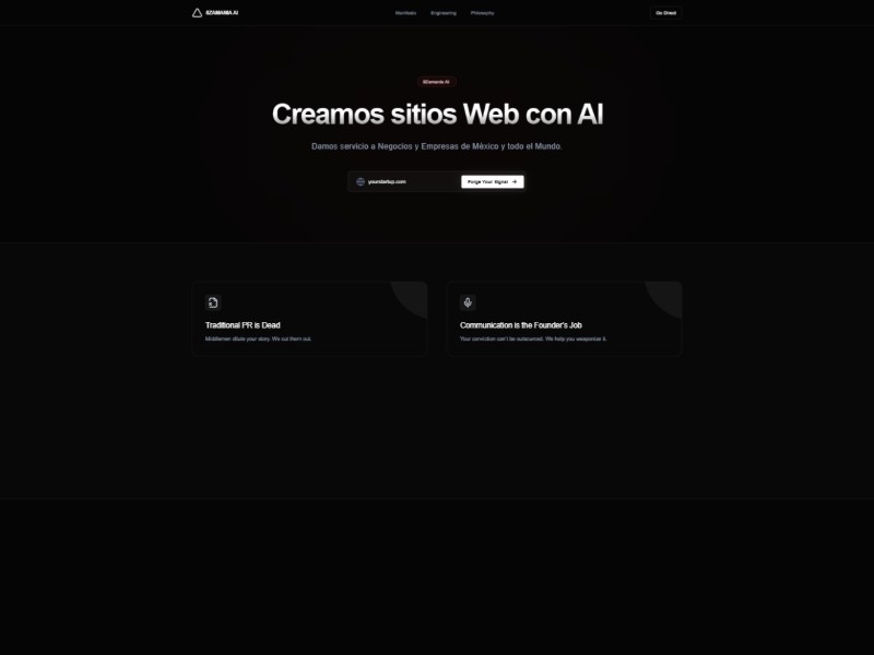 A bold, dark-mode landing page template for AI-powered web and authority-building agencies to showcase services, manifesto, and conversion-focused contact flows.