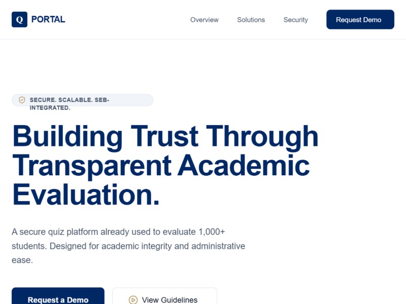 A modern, academic-focused landing page template for promoting a secure quiz and evaluation portal, ready to customize for your own institution or platform.