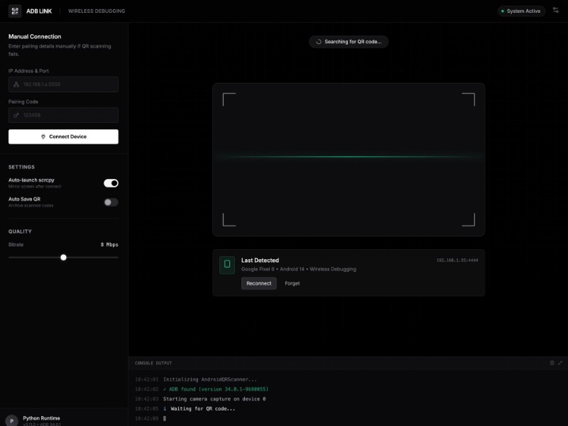 Ideal as a starting template for building desktop-like web tools that manage Android devices over Wi‑Fi, combining QR scanning, device status, and debugging controls in one cohesive interface.