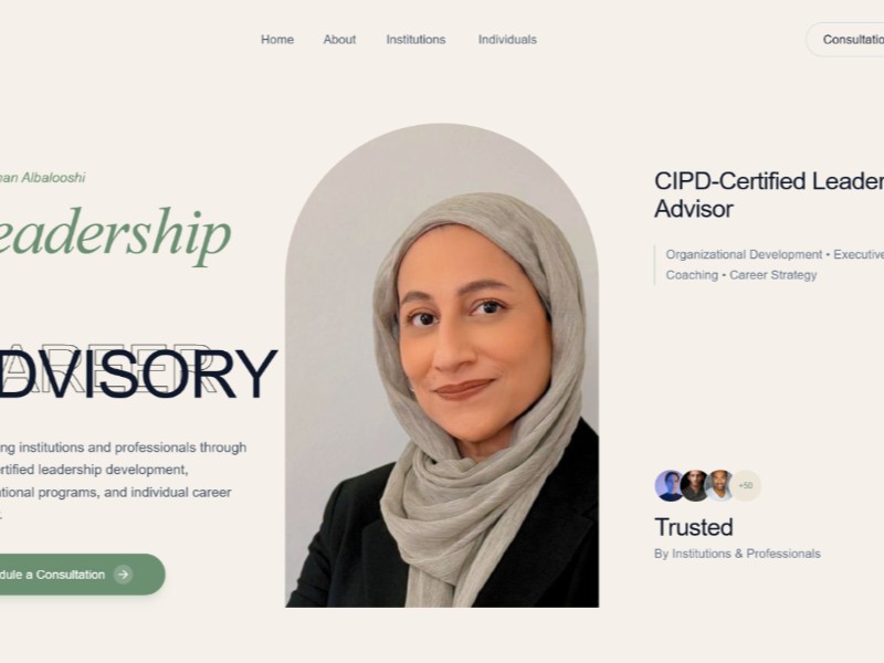A modern personal branding landing page template for leadership and career advisors to showcase services, credentials, and book consultation calls.