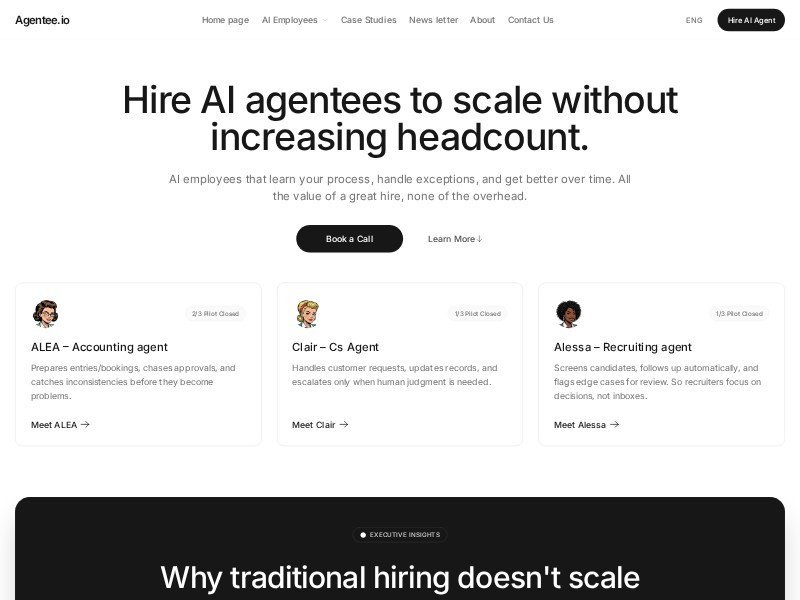 - Agent cards highlighting multiple AI roles (accounting, CS, recruiting) with “meet the agent” links.