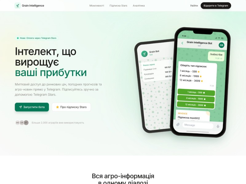 Grain Intelligence is a sleek landing page template built to showcase an agritech Telegram bot with live analytics and Telegram Stars subscriptions.