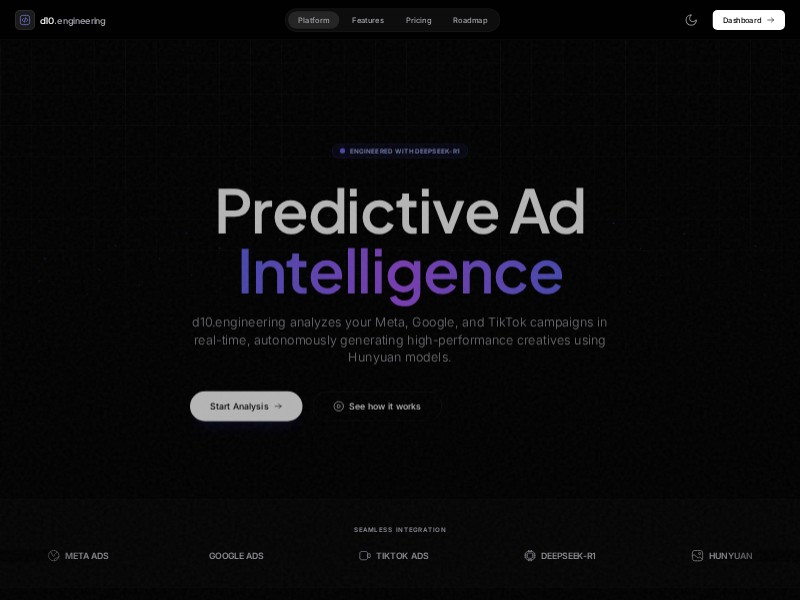 A modern, dark-mode friendly template for AI-powered ad intelligence or marketing analytics platforms.