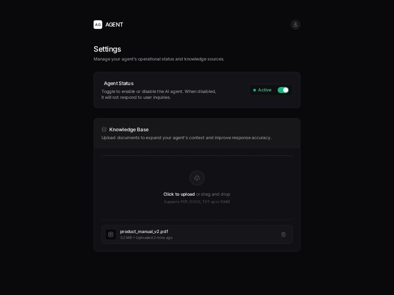A dark-mode dashboard template for managing AI agent status and knowledge base uploads with a clean, modern settings interface.