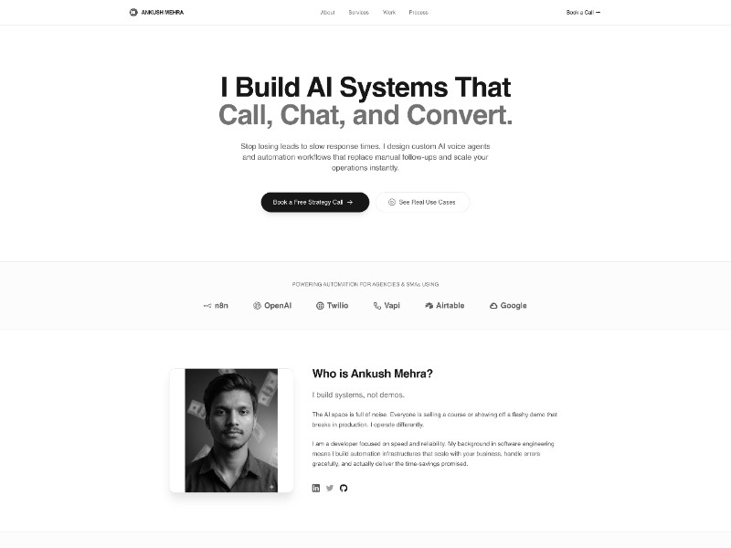 A polished, single-page portfolio template built for AI automation and voice agent developers who need to explain complex systems and convert visitors into booked calls.