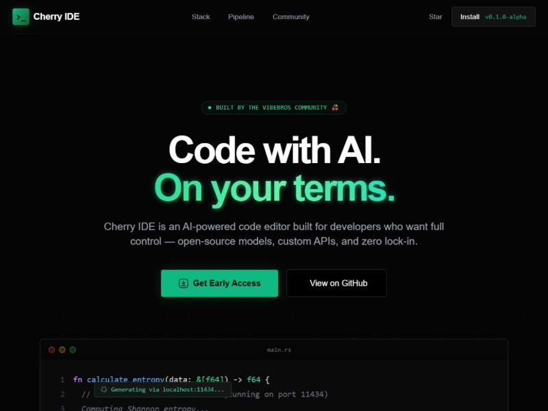 A high-impact, dark-mode landing page template tailored for AI-powered developer tools and open-source IDEs.