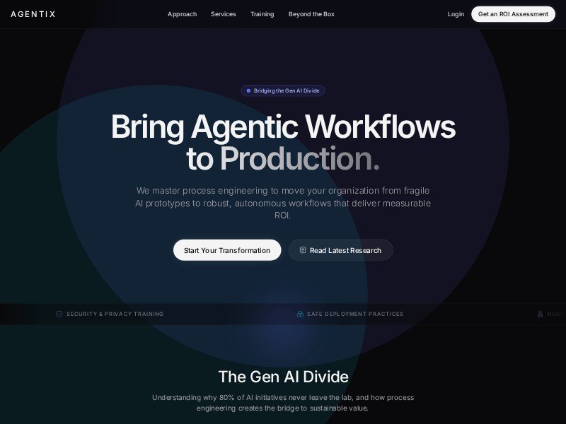 A sleek landing page template for AI consulting, agentic workflow, and enterprise transformation brands. It helps teams present their services, training, research, and ROI-focused value proposition with a polished futuristic look.