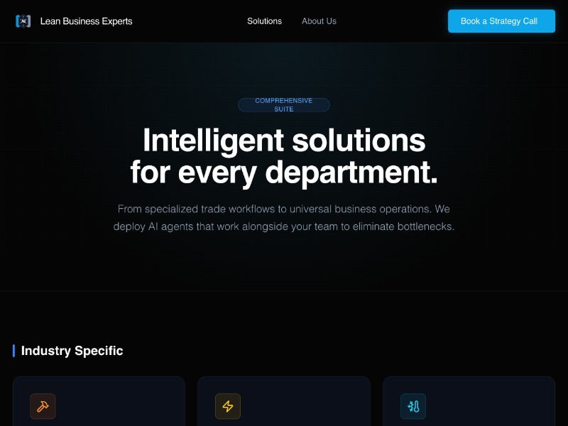 A reusable template for AI-powered business solutions pages showcasing intelligent automation services for operations, logistics, and sales teams.