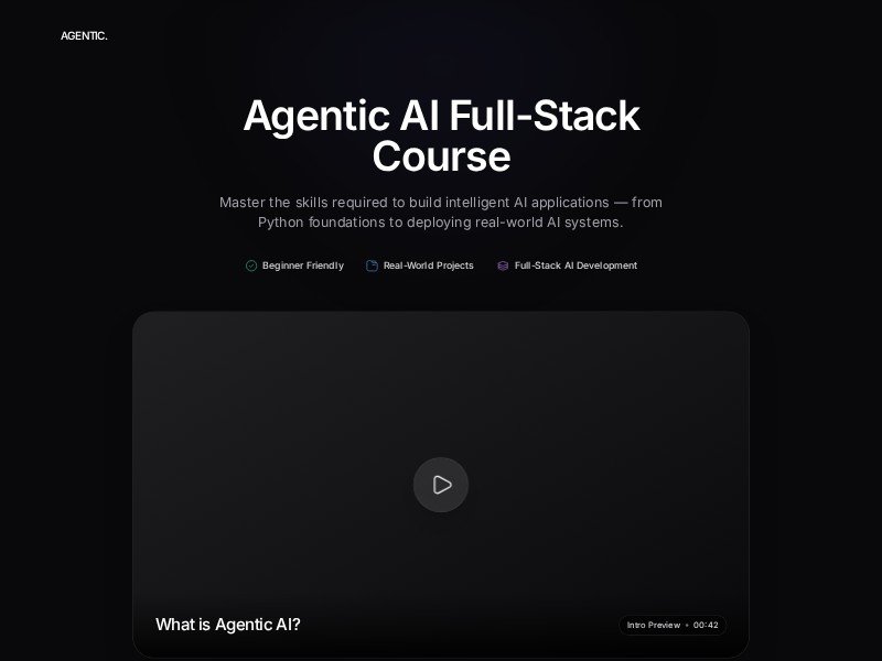 A dark, modern template for promoting an agentic AI full-stack course with video preview, curriculum highlights, and enrollment CTAs.