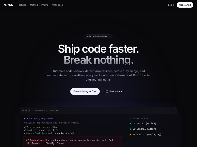 A sleek landing page template for AI-driven DevOps, code review, and deployment orchestration products. Built for SaaS teams that need a premium, technical brand presence.