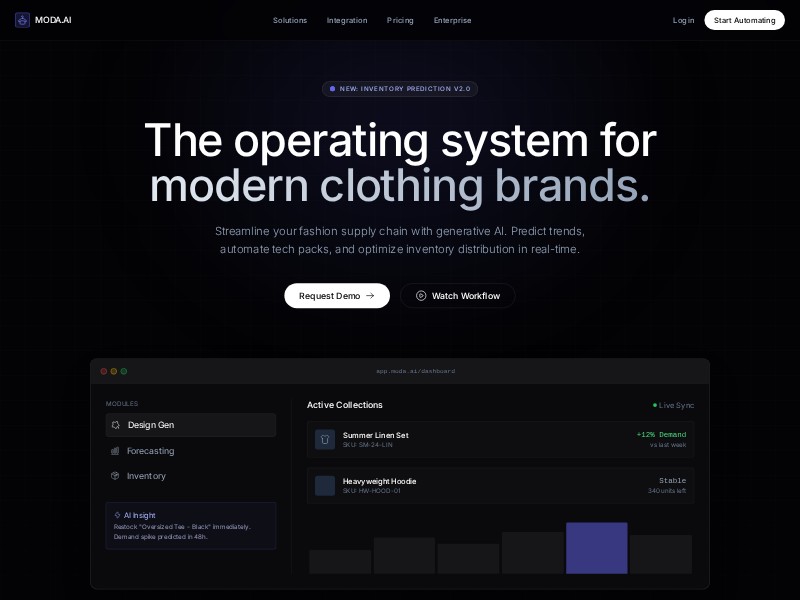 A sleek, dark-mode template for AI-powered fashion automation platforms, ideal for modern clothing brands to showcase forecasting, design, and inventory tools.