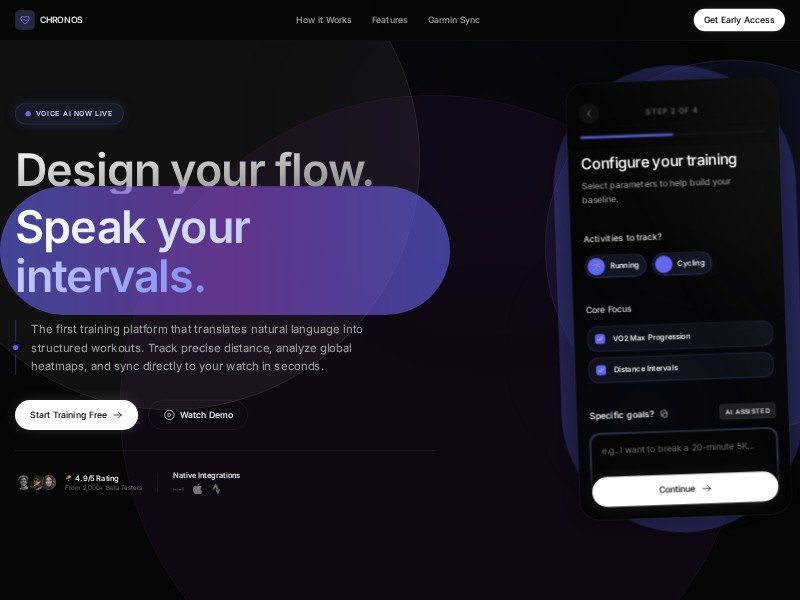 A sleek landing page template for AI-powered training platforms, fitness apps, and sports tech products focused on voice-based workout creation and wearable sync.