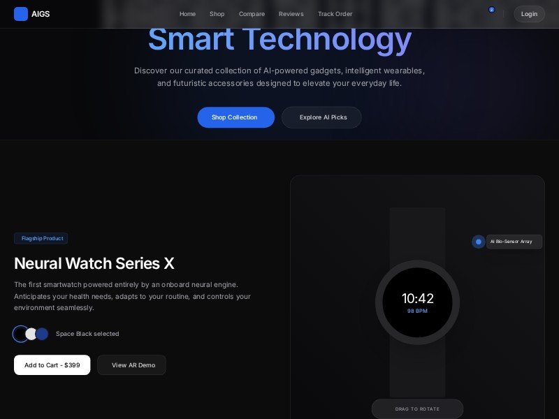 A sleek, dark-mode e-commerce template built for AI gadgets, smart devices, and next-gen consumer tech brands.