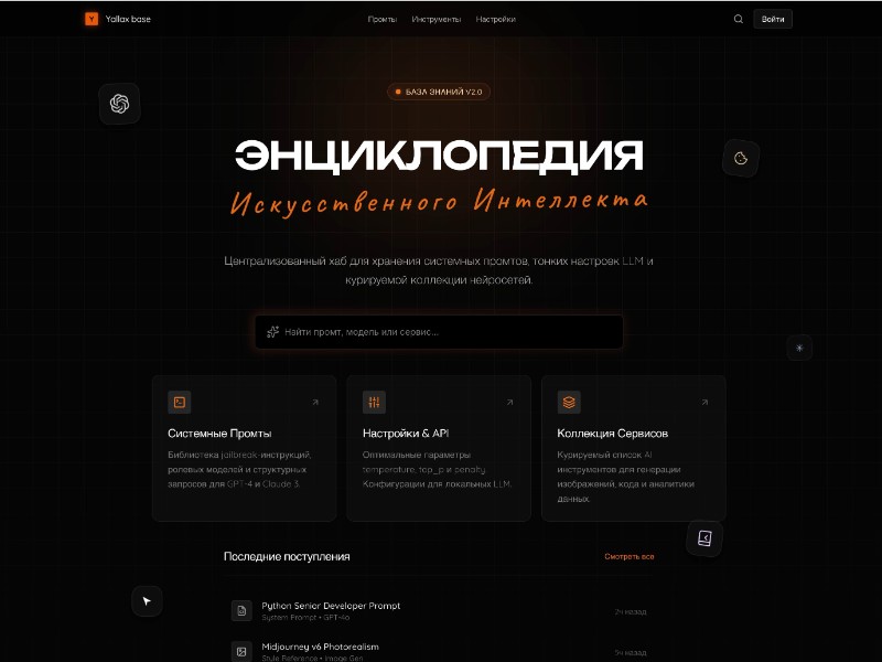 A reusable landing page template designed as a centralized AI knowledge hub for managing prompts, LLM settings, and curated AI tools.