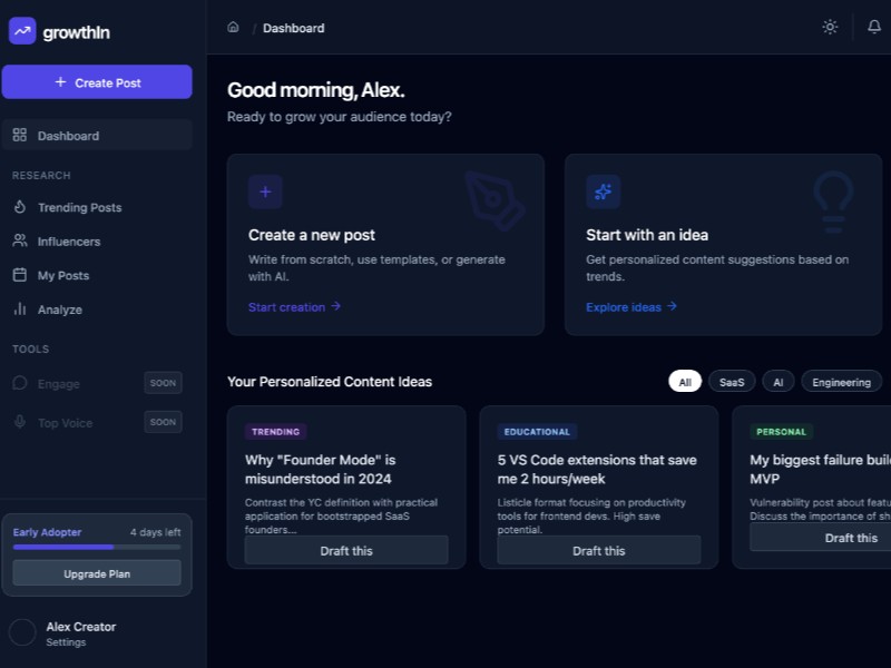 A polished web app UI template for an AI-powered LinkedIn growth tool, featuring research, creation, and scheduling flows in a cohesive dashboard.