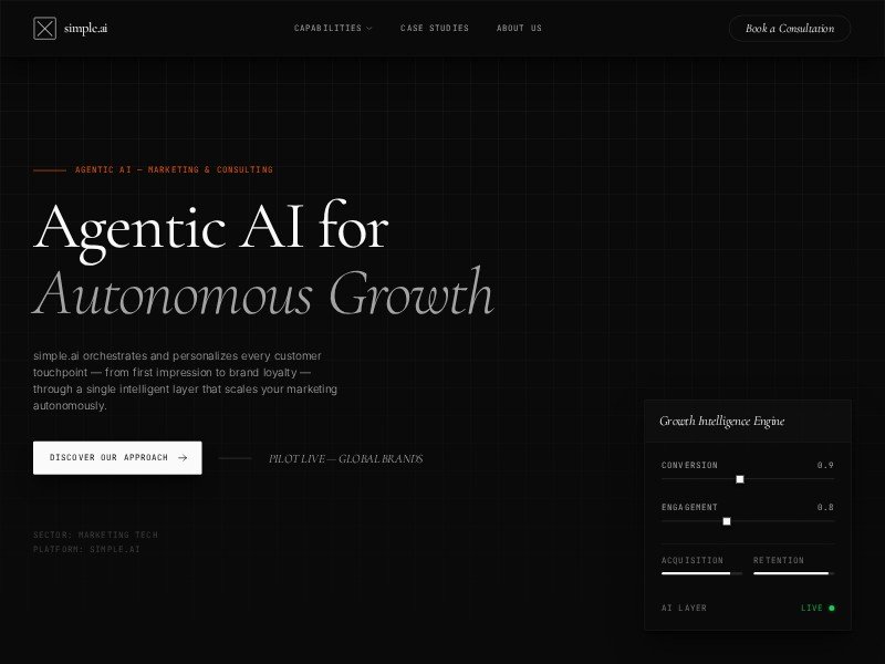 A reusable landing page template for AI marketing and consulting firms to showcase autonomous growth services, proof points, and consultation CTAs.