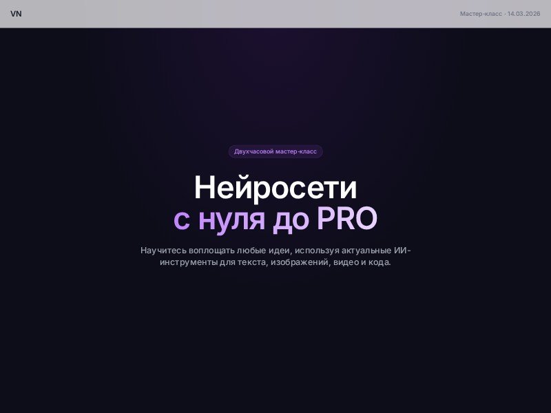 A modern, presentation-style landing page template for AI workshops, creative tech courses, and educational events. It blends bold dark visuals with structured content blocks to explain value, outline the program, and drive signups.