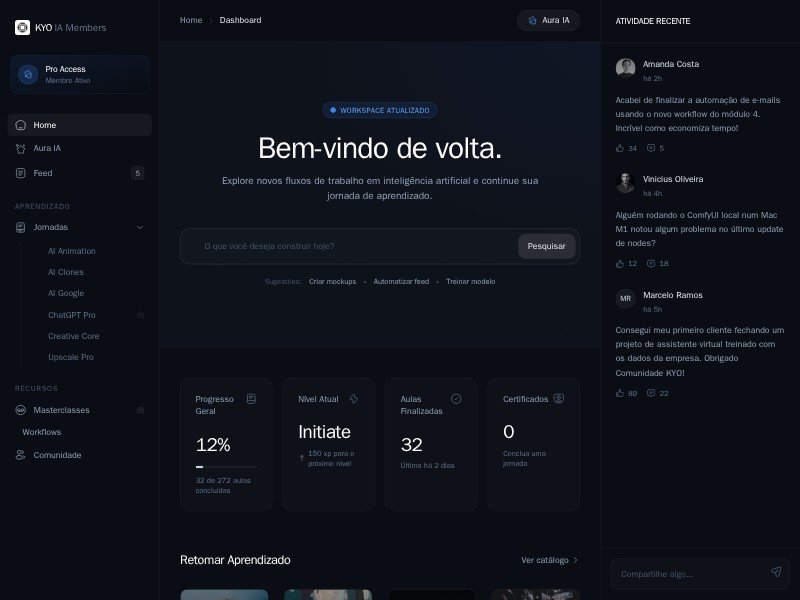 A reusable dark-mode template for AI learning communities and member dashboards, featuring courses, progress tracking, workflows, masterclasses, and social activity.