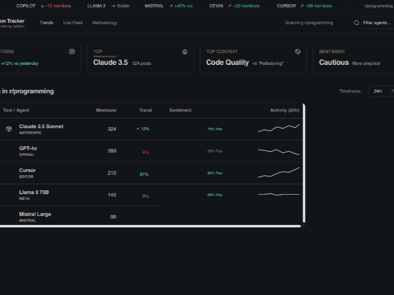 - KPI grid showing 24h mentions, top trending tools, context, and sentiment