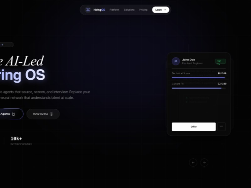 HiringOS is a dark, futuristic landing page template crafted for AI-first recruiting and HR tech products.